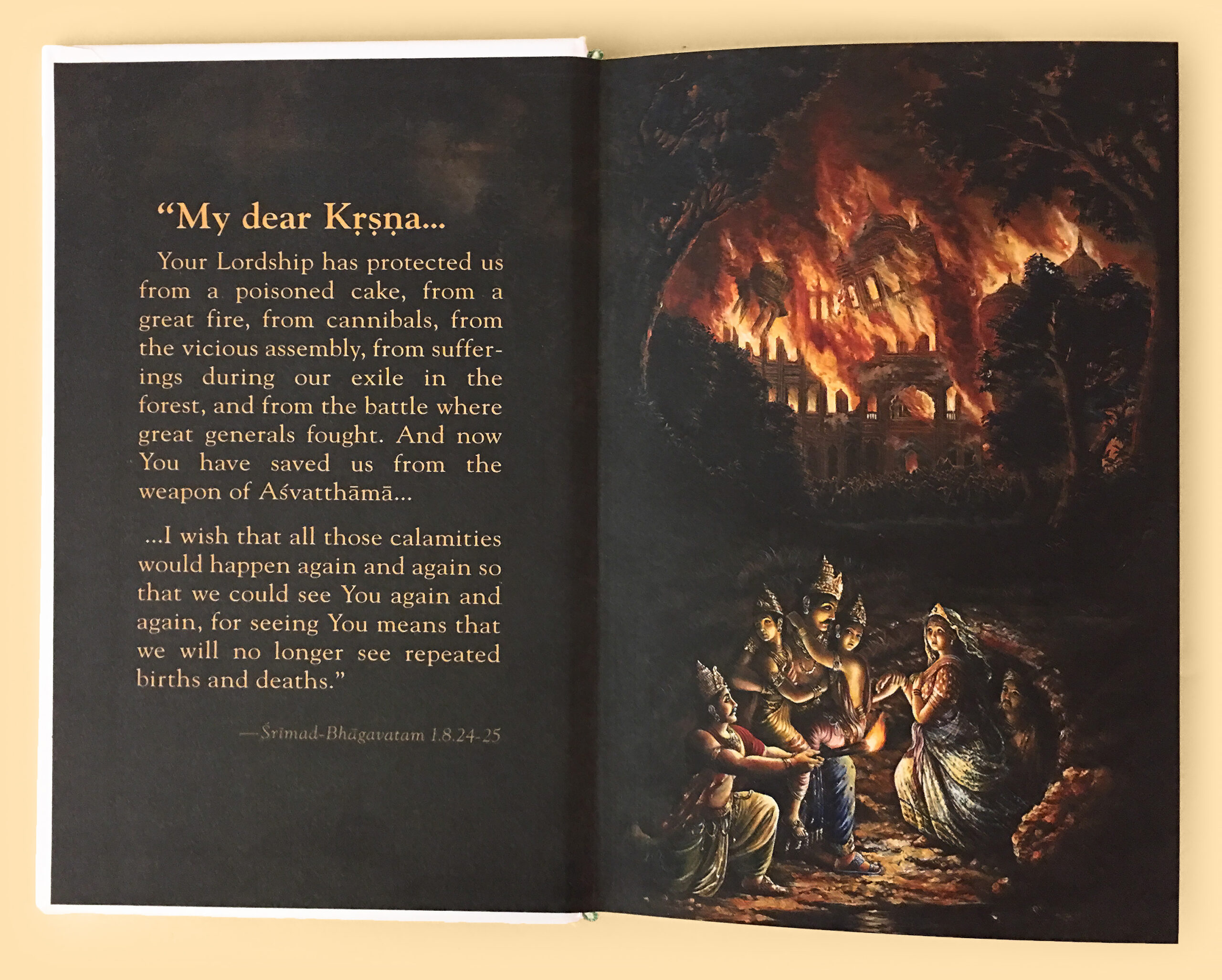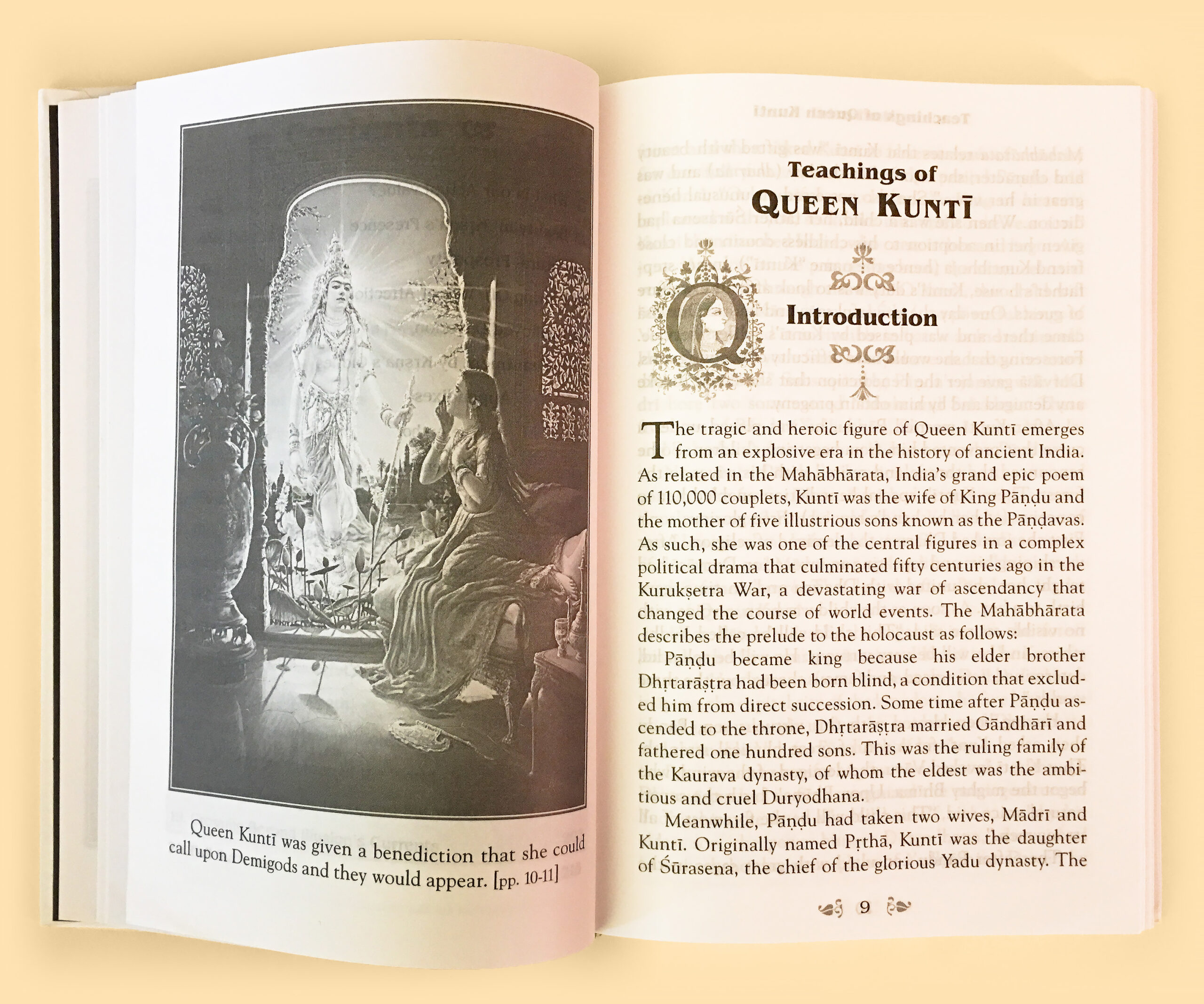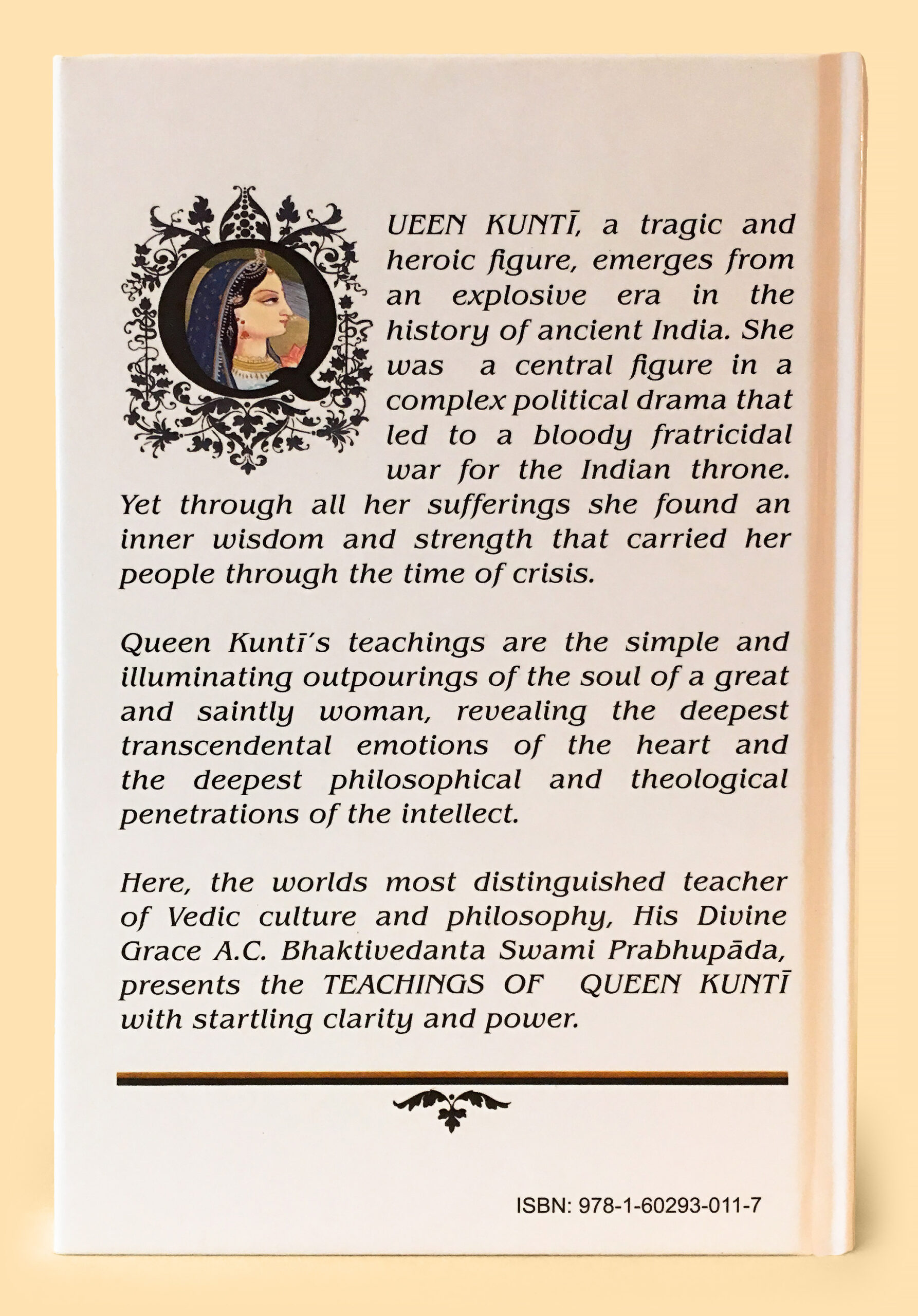 Queen Kuntī appeared as the aunt of Lord Śrī Kṛṣṇa when He personally walked the Earth planet 5,000 years ago. She is famous in the history of India as the wife of the great King Pāṇḍu, and the mother of the five Pāṇḍava brothers. It was a time of great political strife, and the exalted Queen’s family had been through severe difficulties. She knew fear, war, and political intrigue, and experienced the early death of her great husband and the ongoing harassment of hers sons by their envious cousin-brothers. Her love for the Lord never waned, and she never turned from Him, even in the midst of such persecution. The escalating political turbulence eventually resulted in the famous Battle of Kurukṣetra, following which, rightful leadership was established by the personal hand of the Lord. As Śrī Kṛṣṇa was preparing to depart Hastināpura, His purpose there having been fulfilled, Queen Kuntī approached Him on His chariot and offered heartfelt prayers. These prayers, spoken by a most intelligent woman with passion and poignancy, immortalize her great wisdom and devotional heart. Her beautiful, poetic words are recorded in the epic Śrīmad-Bhāgavatam, first canto, eighth chapter, verses 18-43, and have been providing inspiration and insights to countless devotional aspirants for centuries. The combination of the powerful invocations and realizations of the famous Queen Kuntī, and the in-depth explanations and clear perceptions of Śrīla Prabhupāda as he discusses each verse, make for a moving and spiritually educational read. This book has been a source of great solace and upliftment for many people in times of difficulty.